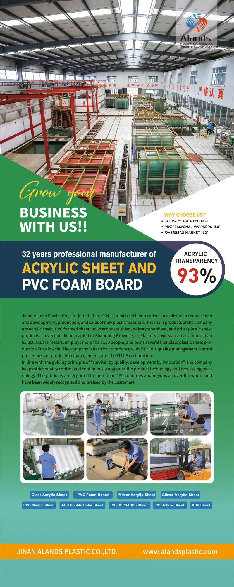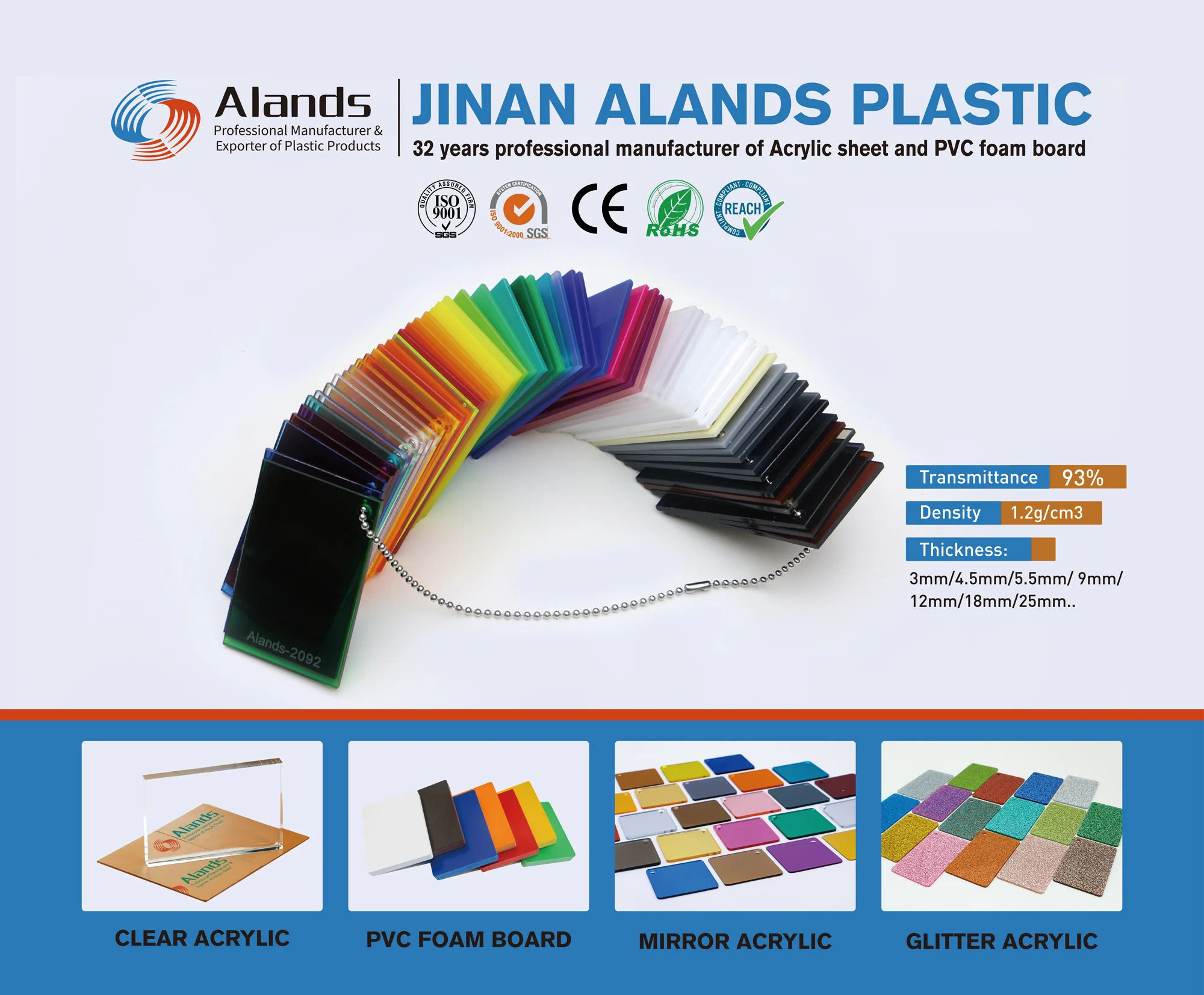 Jinan Alands Plastic is a professional manufacturer of acrylic sheet with 32 years of production experience. The company focuses on acrylic sheet manufacturing and export, while also supplying related plastic sheet products such as PVC foam board.